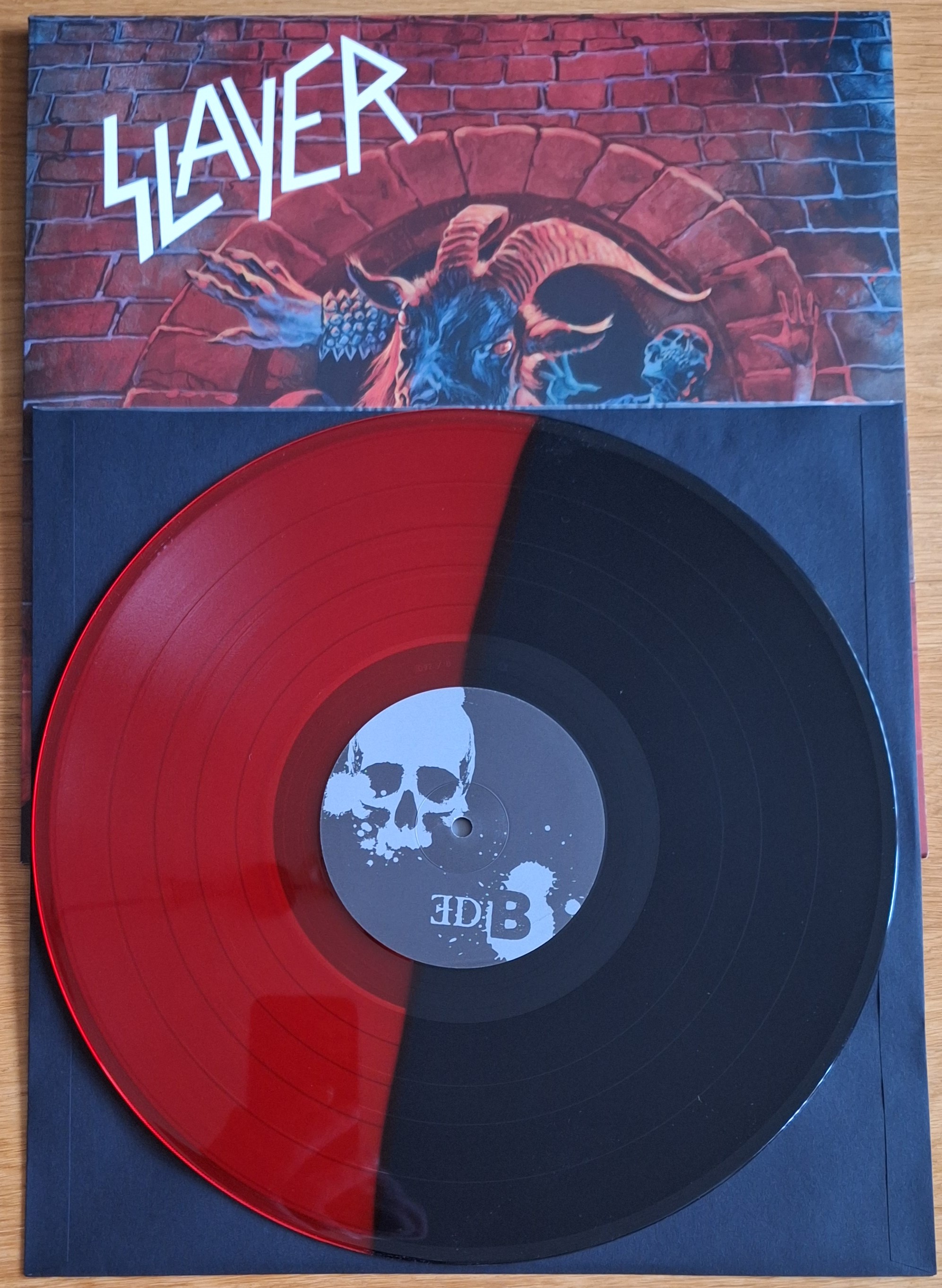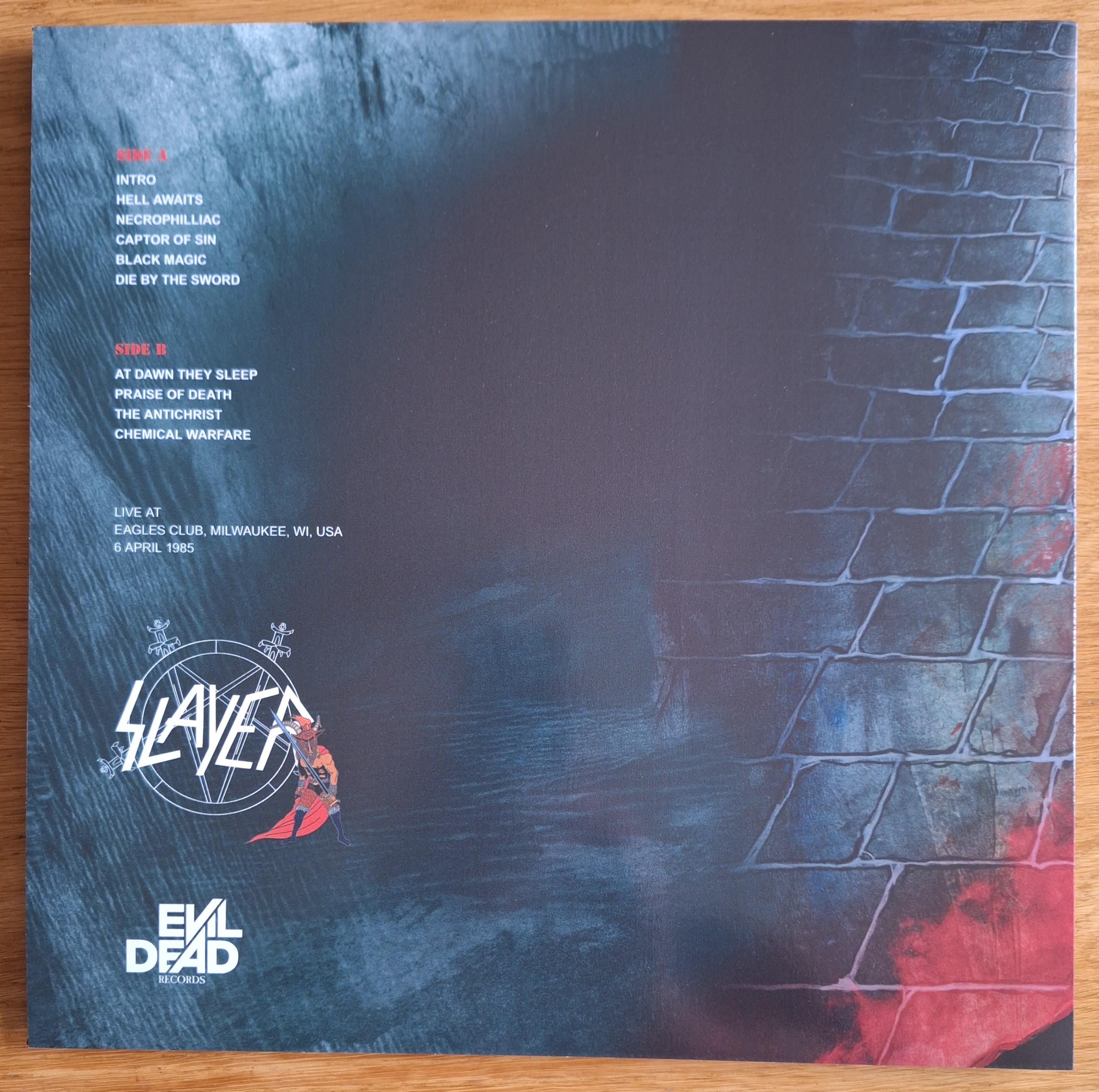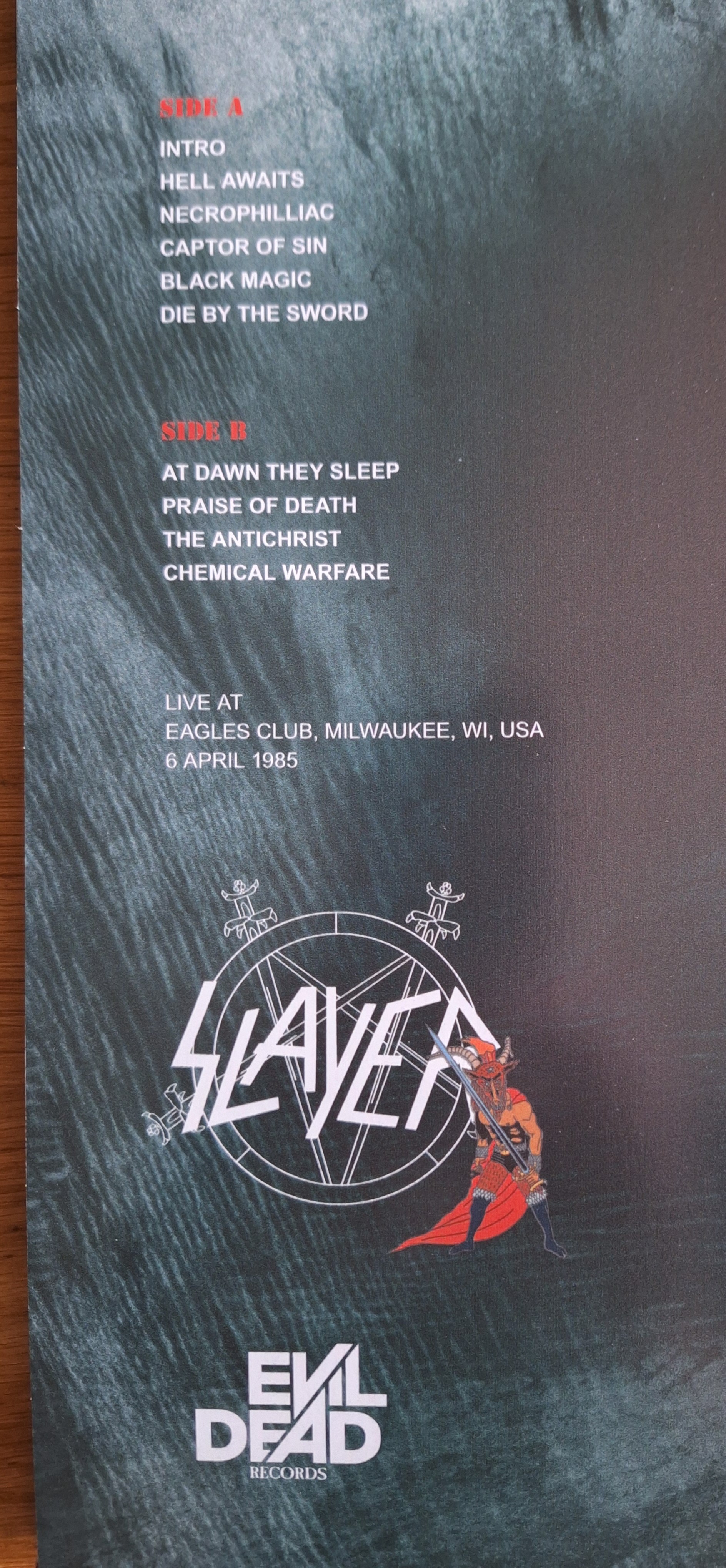 Slayer Combat Tour LP Clear Red / Black Split vinyl', a remarkable addition to any collection of vinyl records. This exclusive vinyl record captures the raw energy and intensity of Slayer's iconic performances during their Combat Tour. Released by Evil Dead Records (EDR 92) in 2025, this limited edition features a meticulously curated tracklist from the legendary performance on 6 April 1985 at the Eagles Club in Milwaukee, WI, USA. The album includes iconic tracks such as 'Hell Awaits', 'Necrophiliac', and 'Chemical Warfare', showcasing Slayer's unparalleled intensity and musical prowess. This record is in Near Mint condition, ensuring an exceptional listening experience. The cover also maintains a Near Mint status, making it a perfect collectible for enthusiasts of vinyl bootlegs and dedicated fans of Slayer.